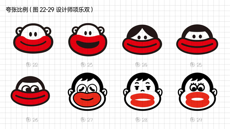 1)比例夸張:平面構(gòu)成中,特異是一個提升識別度和獨(dú)特性的表現(xiàn)手法,抓住香腸嘴“面部占比大”的特性,嘗試放大嘴唇輪廓到極致,夸張到比臉還大。
