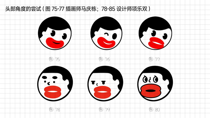 1)頭部角度的嘗試:嘗試把人物頭轉(zhuǎn)過去的感覺,突出香腸嘴的體積感。結(jié)合快速拼圖法快速出符號,發(fā)現(xiàn)該方向沒有達(dá)到特別的效果,犧牲了極簡的中軸對稱策略,整體氣質(zhì)卻不夠有張力和沖擊力。