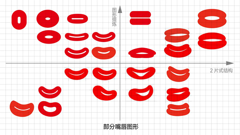 5)嘴唇圖形的提煉:進(jìn)行了寫實(shí)、概括、提煉、變化的不同嘗試,我們重新整理復(fù)盤,嘴唇的簡化圖形,從構(gòu)成上主要分成2種,是2個橢圓,還是3個橢圓的變形(下圖)。